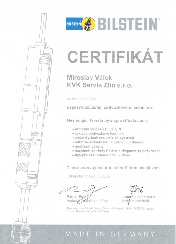 Certifikát BILSTEIN - Miroslav Válek