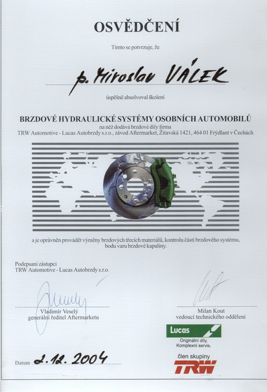 Certifikát Brzdové systémy