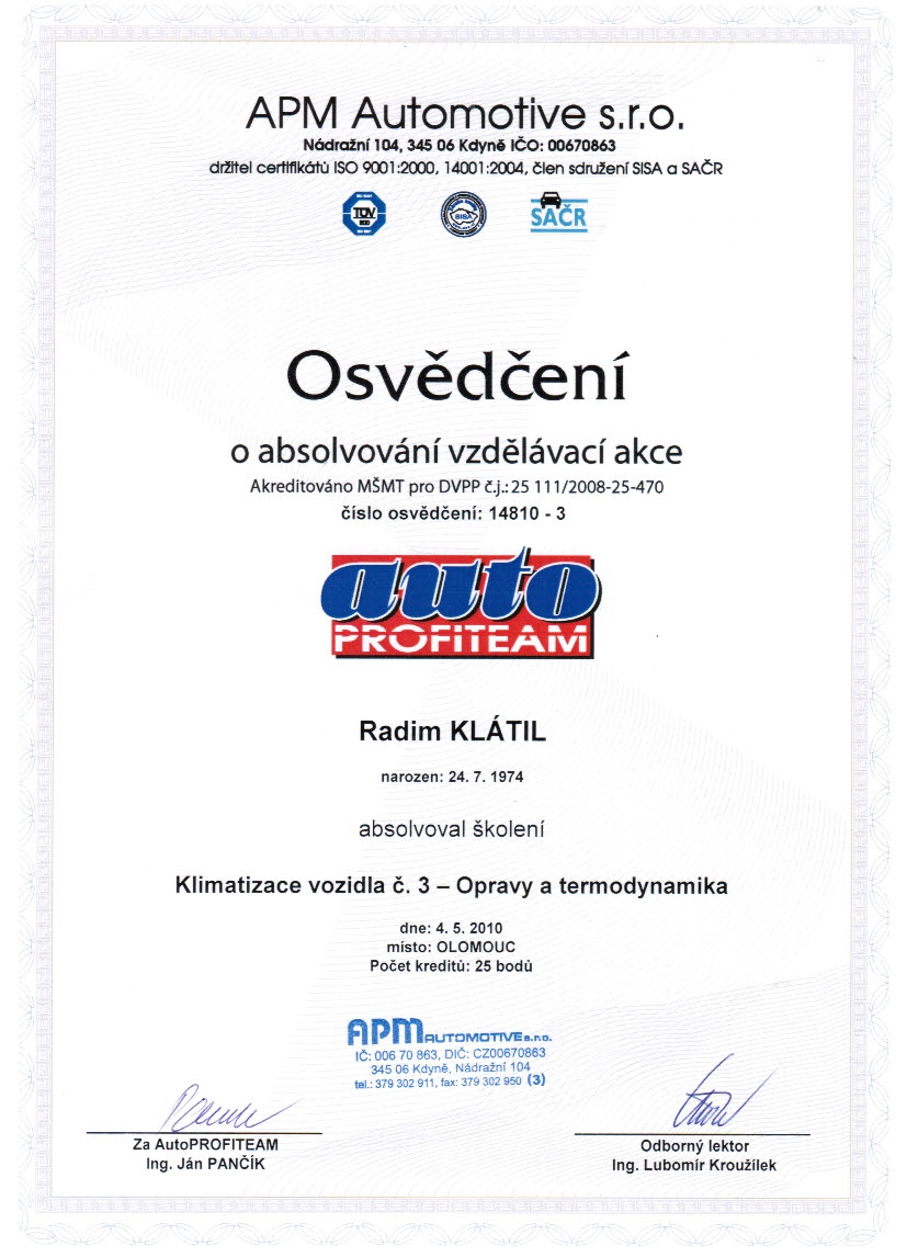 Certifikat klima 1  - Radim Klátil